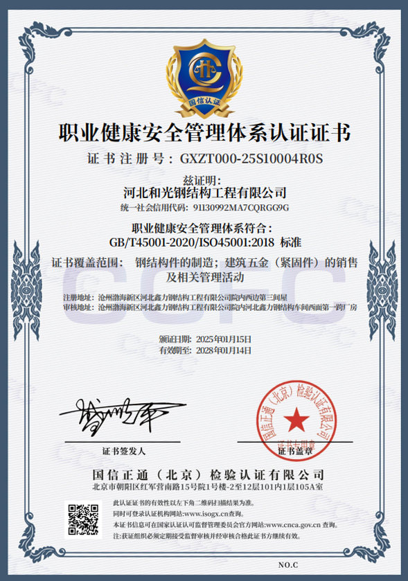The company is located in the beautiful Bohai New Area Equipment Manufacturing Park of Huanghua Port, covering an area of 158.4 acres. It has a steel structure processing and manufacturing workshop of 30,000 square meters, equipped with three modern production lines and an independent spraying workshop of 2,500 square meters. The raw material storage capacity is 800 tons, and the annual production capacity can reach 45,000 tons.The company adheres to the philosophy of "credibility first, quality supreme," utilizing advanced domestic steel structure processing technology and equipped with state-of-the-art machinery, which embodies a high level of technical sophistication and modernization.Clients: We provide our clients with high-quality and maximally valuable specialized products and services, winning their understanding, respect, and support with our sincerity and strength.Employees: We trust in the hard work and dedication of our employees, recognize their achievements, and provide corresponding rewards, creating a good working environment and development prospects for them.Development: We pursue the goal of sustainable development, basing it on customer satisfaction. The corporate spirit is confidence, self-discipline, self-reliance, and self-strengthening.